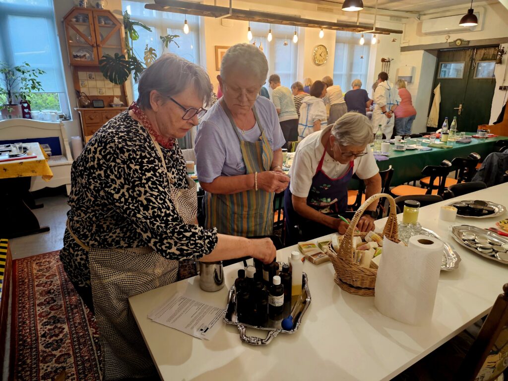 Am Freitag, dem 29.08.2025, trafen sich unsere beiden Koordinatorinnen und 15 Ehrenamtliche in der Seifenscheune Niedtal in Hemmersdorf zu einem spannenden Workshop. Unter der fachkundigen Anleitung der Inhaberin, Ruth Jungmann, stellten die Teilnehmenden Seifen, Dusch-Smoothies und Körperlotionen her. Verwendet wurden hochwertige Öle und Fette. Die selbst gemachten Produkte durften die Teilnehmenden mit nach Hause nehmen. Der Abschluss des geselligen Tages fand im Gasthaus „Gellenberg“ statt. (JKK)